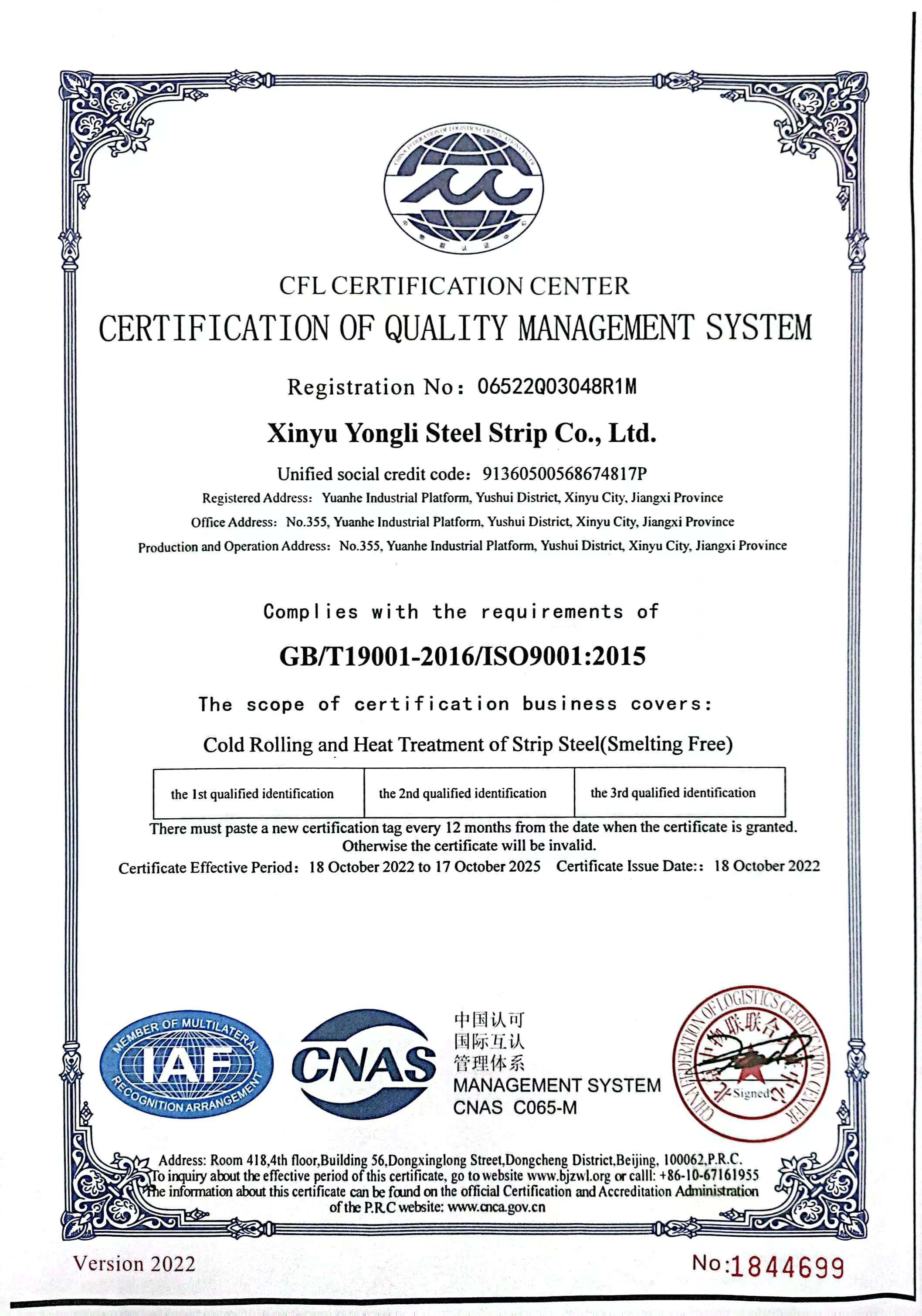 Xinyu Yongli Strip Steel Co., Ltd. находится в городе Xinyu, провинция Цзянси, которая является известной национальной базой производства марганцевой стали. Основана в 2011 году, занимает площадь более 50 му, наша команда имеет более 20-летний опыт работы в индустрии пружинных стальных полос, является производителем высококачественной холоднокатаной полосовой стали и закаленной и отпущенной стальной полосы. Мы инвестировали в общей сложности 100 миллионов юаней, у нас 200 сотрудников, ежегодный выпуск составляет 50 000 тонн.